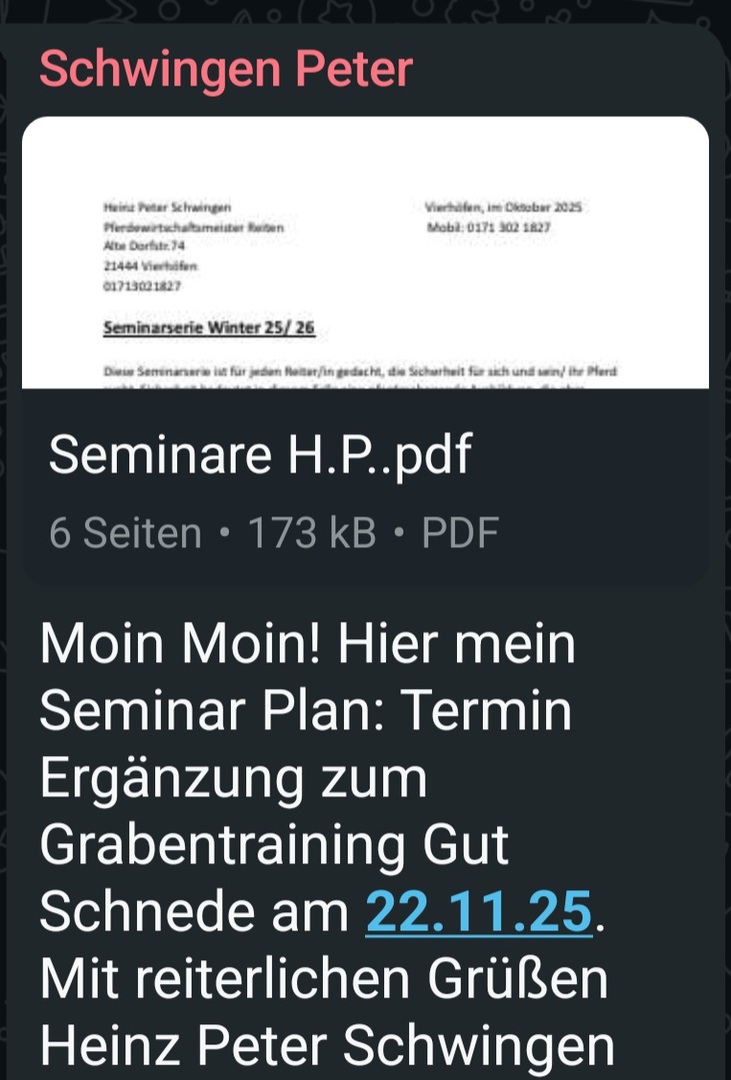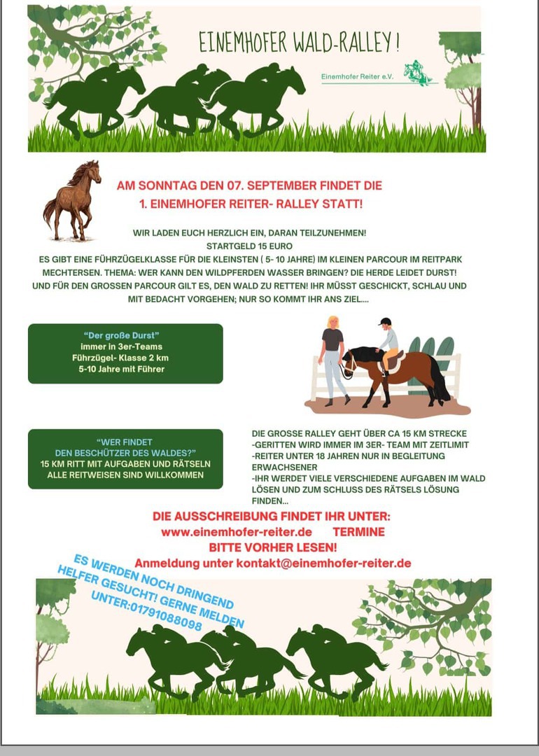 der Verein weist auf die jeweils jährlich stattfindende Schleppjagd des RuF Vögelsen Mechtersen hin, die am Sonntag, den 05.10.2025 ab 11:00 Uhr in Mechtersen (Stelldichein im Reitpark Mechtersen) stattfindet. Auf die beigefügte Anlage wird verwiesen.